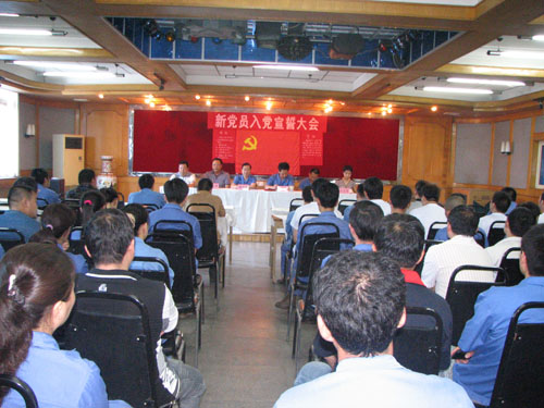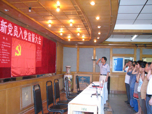 7月1日上午9點,隨著雄壯的《國際歌》的奏響,公司舉行的2009年新黨員入黨宣誓大會正式開始。公司黨委成員侯向保、宋元祥、李建軍、鄭小立、徐文剛出席宣誓大會。大會由公司黨委副書記宋元祥主持。