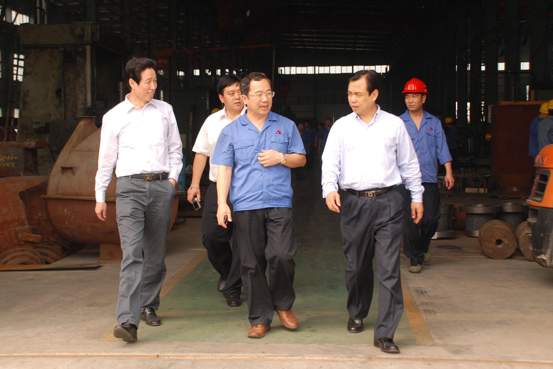 任沁新一行先后到重機(jī)廠、金結(jié)廠以及在新廠區(qū)生產(chǎn)作業(yè)的中凱礦機(jī)公司、華凱鑄鍛鑄鐵廠現(xiàn)場實(shí)地考察。來到一個(gè)同行業(yè)的生產(chǎn)現(xiàn)場,他倍感親切,不時(shí)地在不同生產(chǎn)設(shè)備及半成品、產(chǎn)成品前和公司董事長侯向保親切交談。